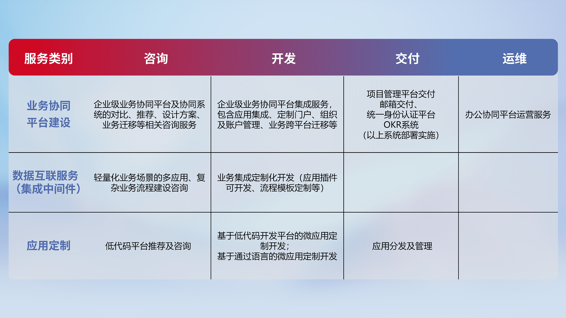 针对钉钉、、、、企微、、IDaas等平台级产品提供产品的规划、、方案、、、、交付、、、、定制化开发等服务,,,,实现如统一协同办公、、、、智能客户服务、、、混合会议管理、、、、智能数据查询、、、等业务场景,,,,实现数字化转型。。